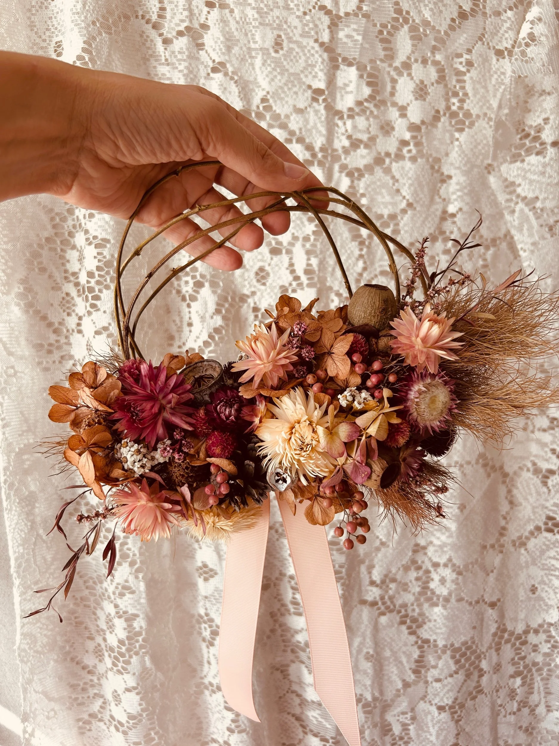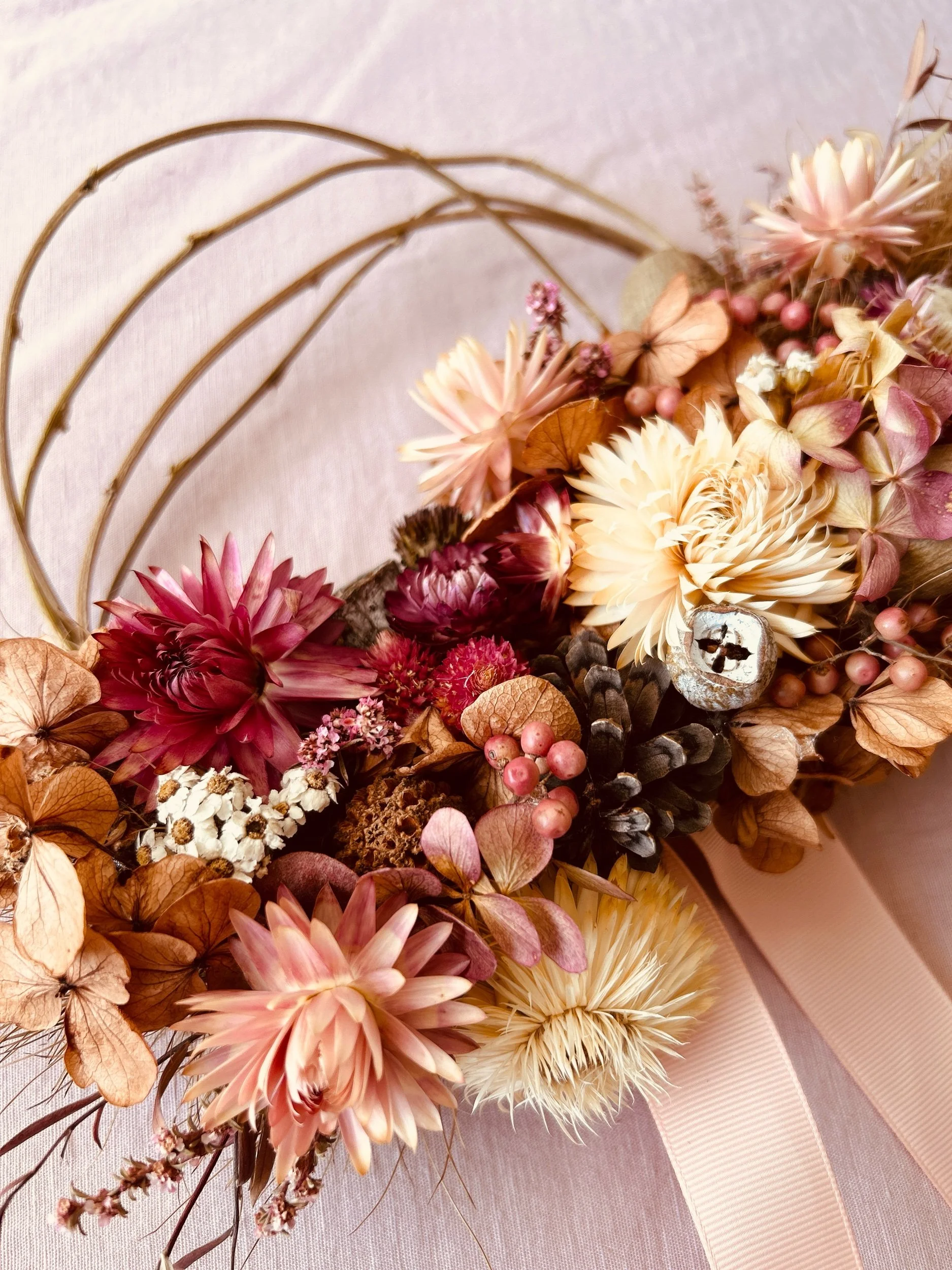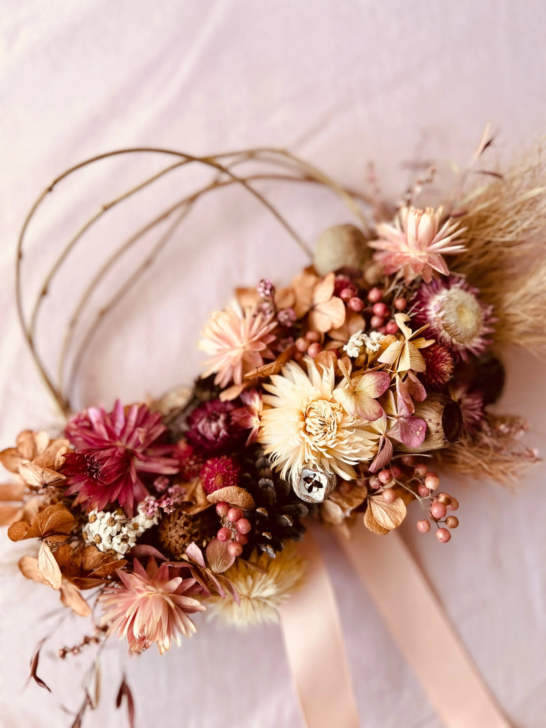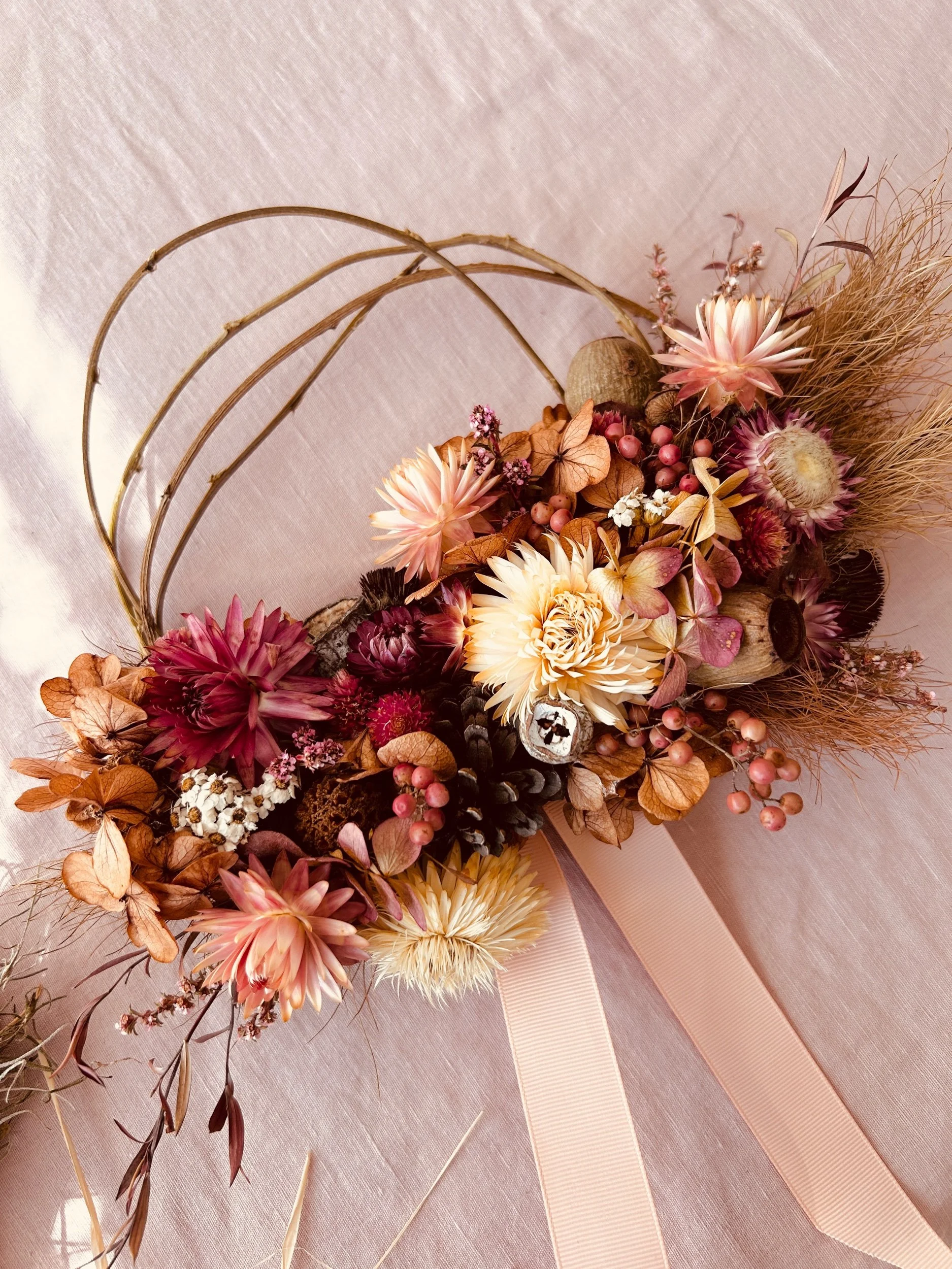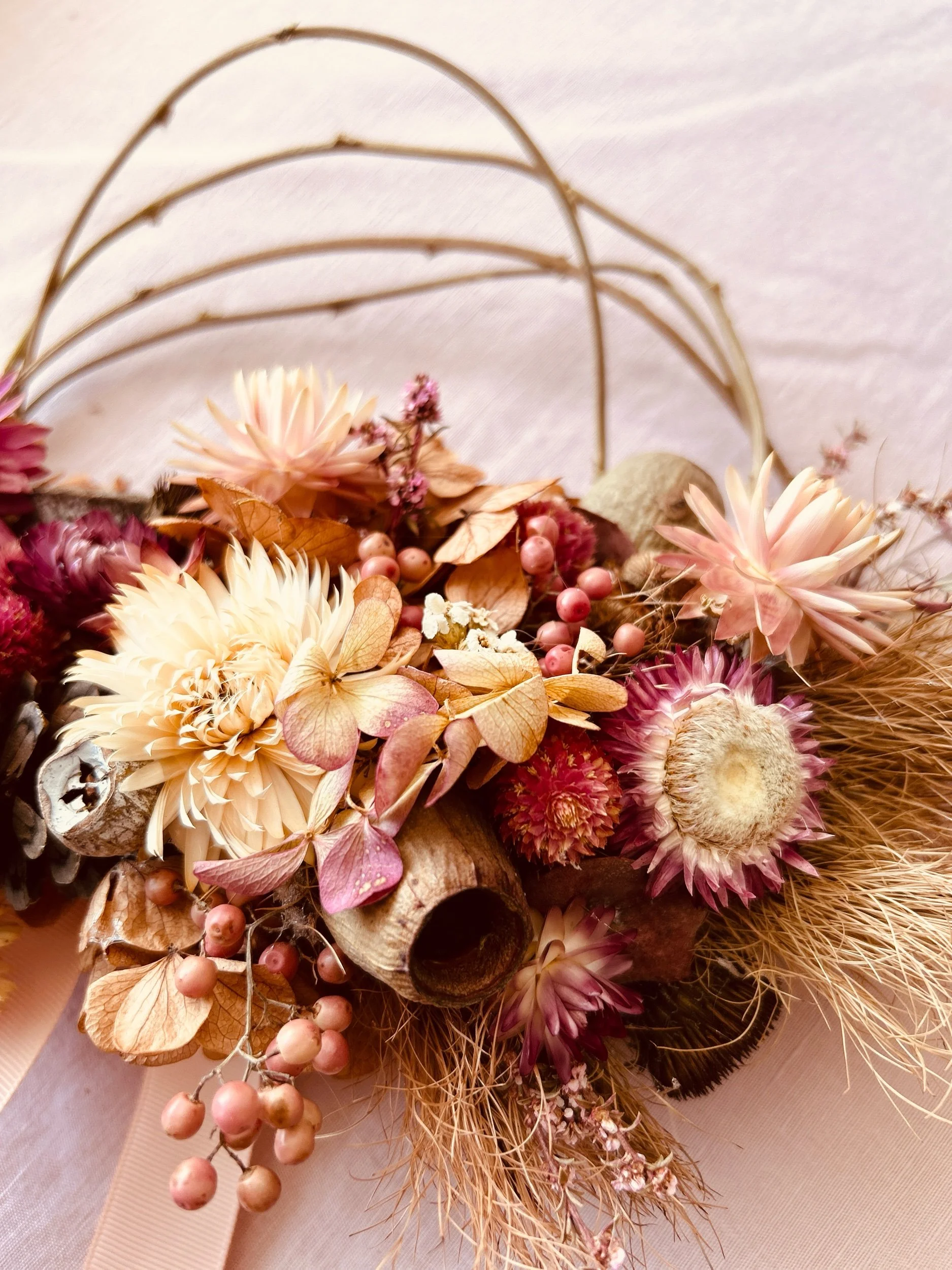 Dried Flower Wreath 2: A wisteria wreath base with a variety of pink and neutral blooms including paper daisies and hydrangea with pepper berries, gumnuts and pinecones. Approx. 18cm -20cm diameter.